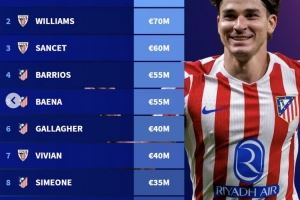西甲非皇马和巴萨球员身价前十:小蜘蛛1亿欧第一,马竞6人上榜