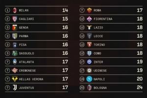 由于人数有限,还带来了另一个结果,那就是米兰是目前本赛季意甲使用首发球员最少的球队,只有14名球员担任过首发。