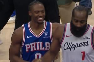 气着呢!马克西一路搂着哈登试图寒暄 哈登左右游走没心情理
