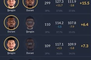 杜兰特和申京同场时,火箭进攻效率127.3,防守效率111.9,净效率+15.5;